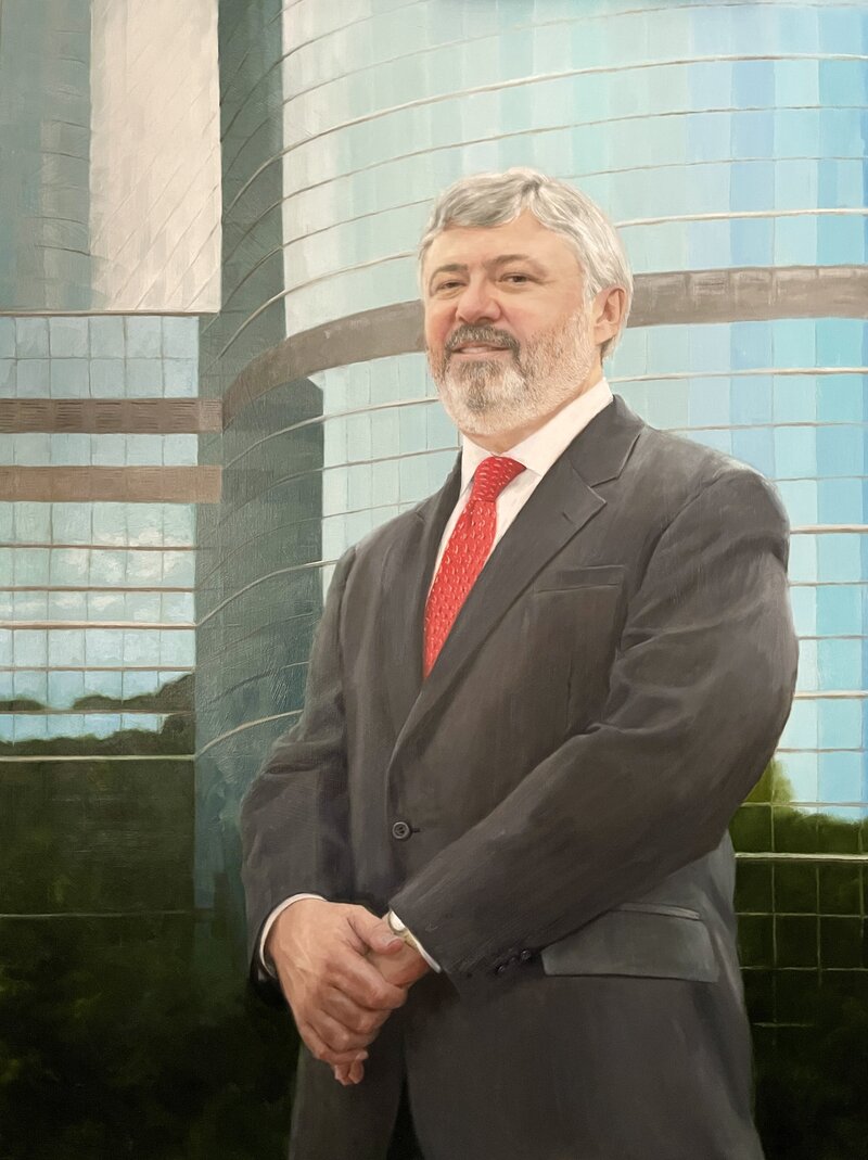 I was commissioned to paint Dr. Ed Murphy’s portrait posthumously, which is always challenging. I painted Dr. Murphy standing in front of one of his many great accomplishments during his stint as CEO of Carilion Clinic, the new massive wing of the Community Hospital.